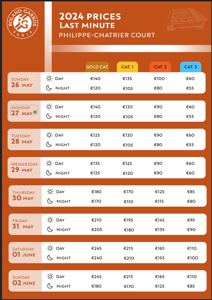 | Jun 9, 2024, 8:00AM Sun | Chatrier, Access C13, Cat 1, Row 11, Seat 91, MF*** | € 1670.00 |