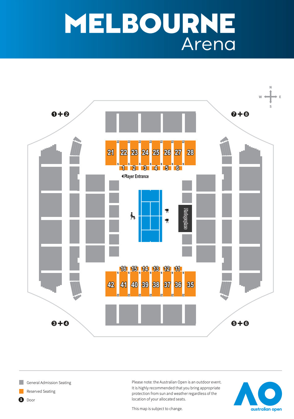 | Rod Laver Arena | Right | Section 9 to 11 (baseline) Section 8 and 12 (corner) |
