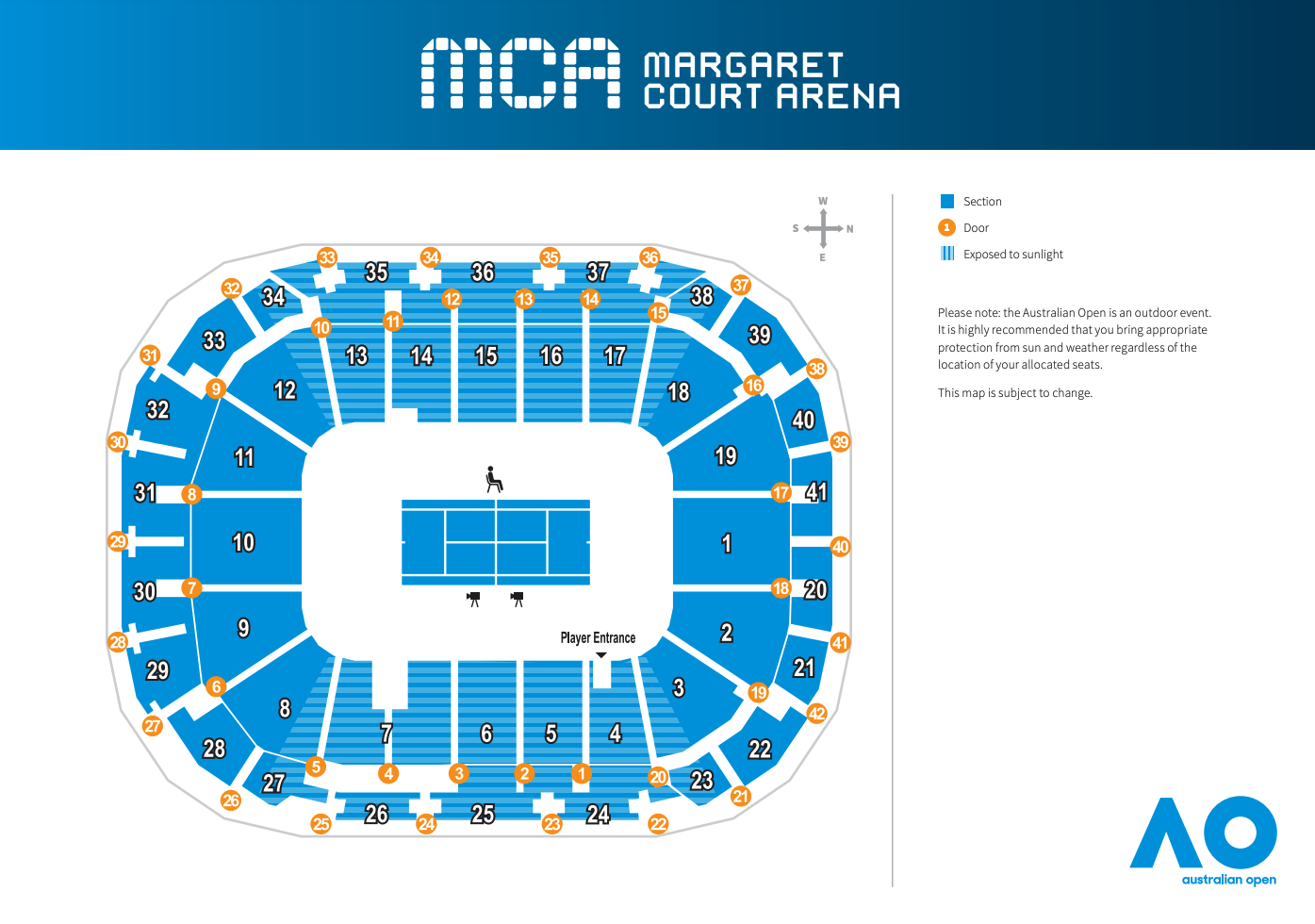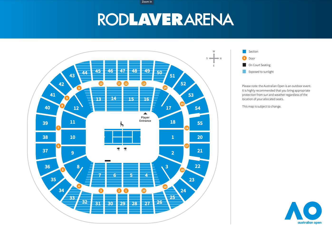 | Rod Laver Arena | Left | Section 1,2 and 18 (baseline) Section 3 and 17 (corner) |