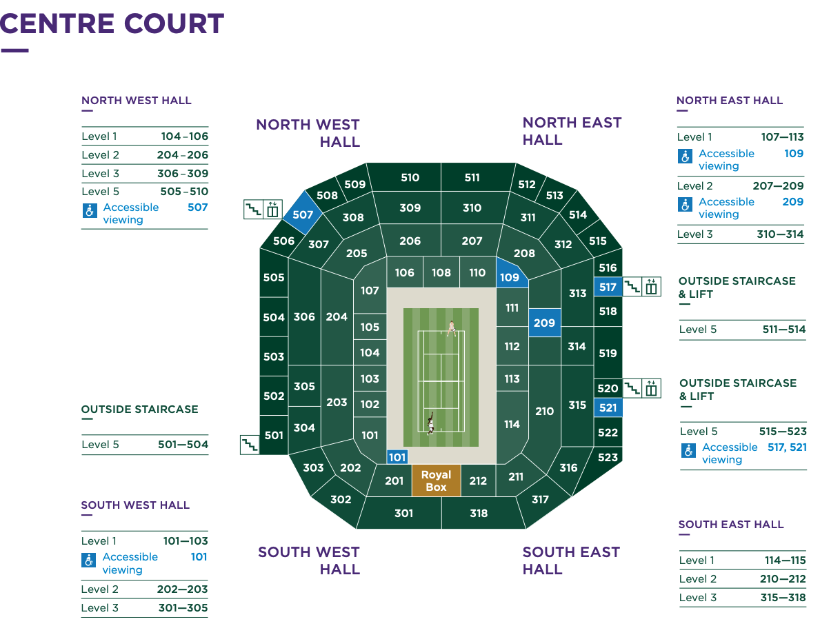 | Wimbledon Center Court | Right | Gangway 201, 212 (baseline) Gangway 101, 114, 115 (corner) |