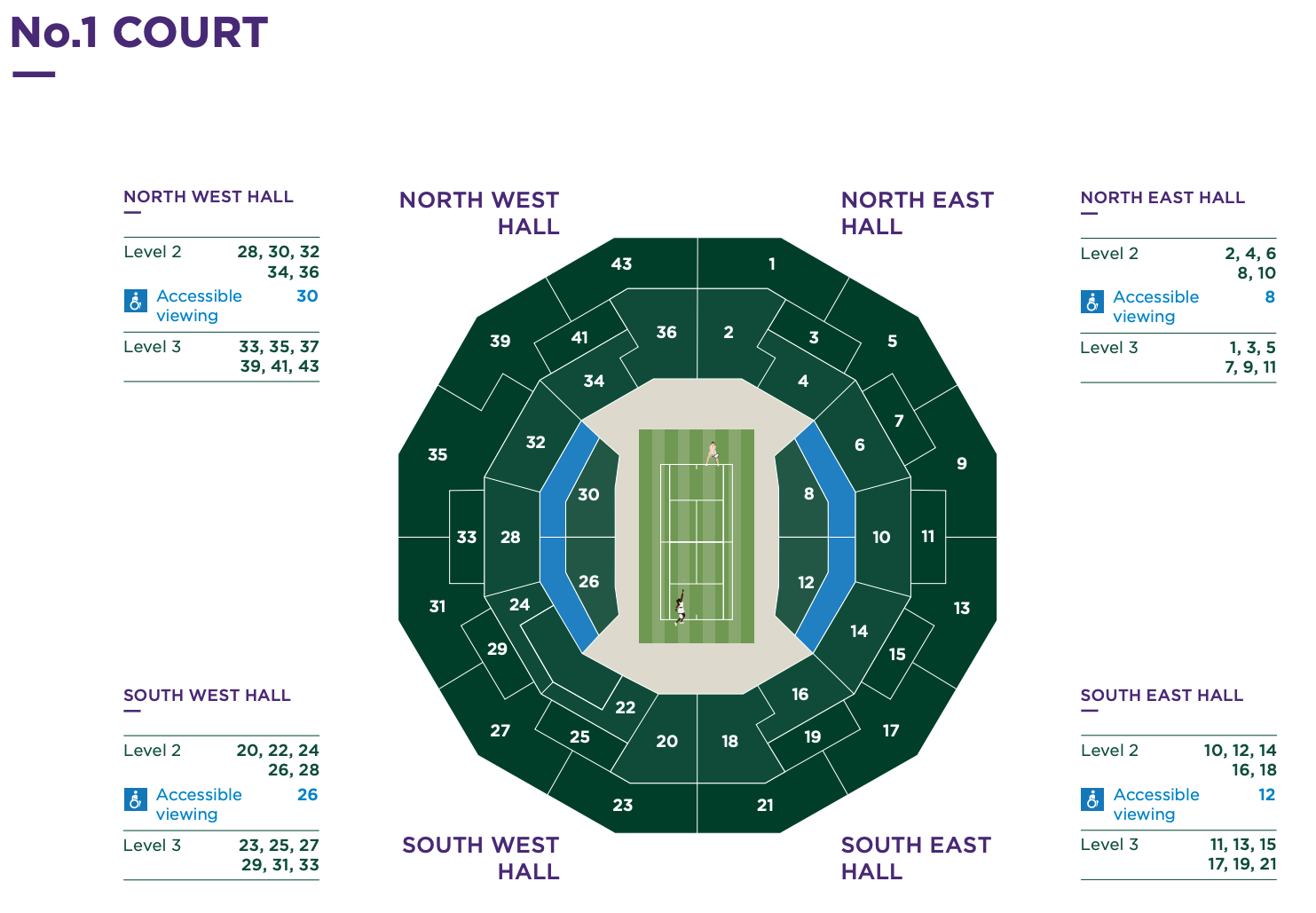| Wimbledon Court 1 | Left | Gangway 2, 36 (baseline) Gangway 4, 34 (corner) |