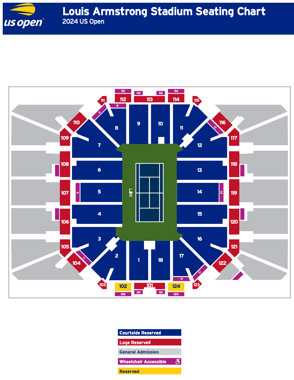 | Louis Armstrong | Right | Section 1 and 18 (baseline) Section 2 and 17 (corner) |